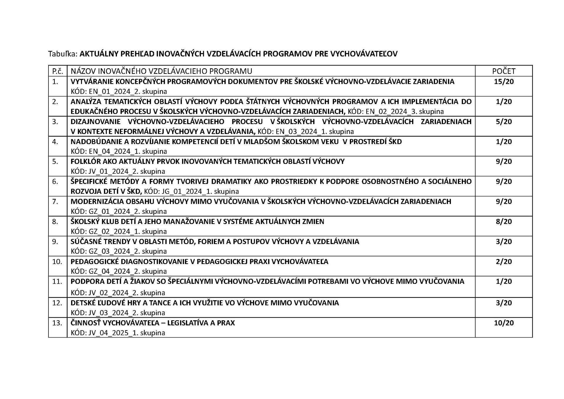V zmysle § 55 a § 56 Zákona č. 138/2019 Z.z. o pedagogických zamestnancoch a odborných zamestnancoch a o zmene a doplnení niektorých zákonov ponúkame inovačné vzdelávacie programy, ktoré sú zamerané na prehĺbenie, rozšírenie a inováciu profesijných kompetencií potrebných na výkon pracovnej činnosti vychovávateľov a asistentov vychovávateľov, ďalej na uplatnenie najnovších poznatkov a skúseností z praxe vo výchove mimo vyučovania.