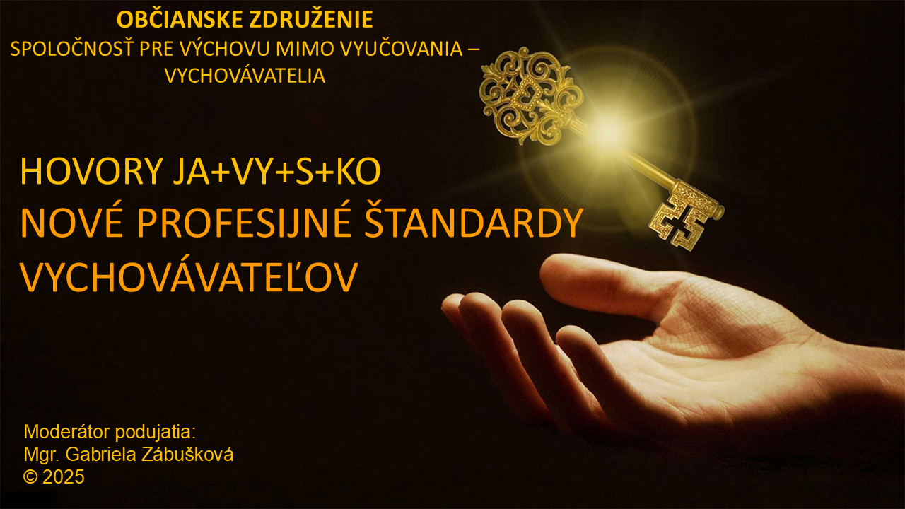 V mesiaci október 2025 plánujeme uskutočniť 2 podujatia HOVORY JA+VY+S+KO s identickými témami NOVÉ PROFESIJNÉ ŠTANDARDY VYCHOVÁVATEĽOV + LEGISLATÍVNE ZMENY V PRÁCI VYCHOVÁVATEĽOV V ROKU 2026 + KVALITA PREDNÁŠOK NA ODBORNEJ KONFERENCII VYCHOVÁVATEĽOV + DISKUSIA.