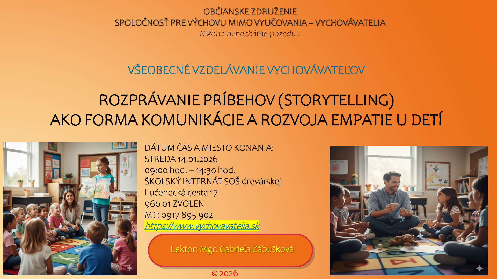 NÁZOV PRVEJ PREDNÁŠKY, WORKSHOPU A ODBORNEJ KONZULTÁCIE: ROZPRÁVANIE PRÍBEHOV (STORYTELLING) AKO FORMA KOMUNIKÁCIE A ROZVOJA EMPATIE U DETÍ.